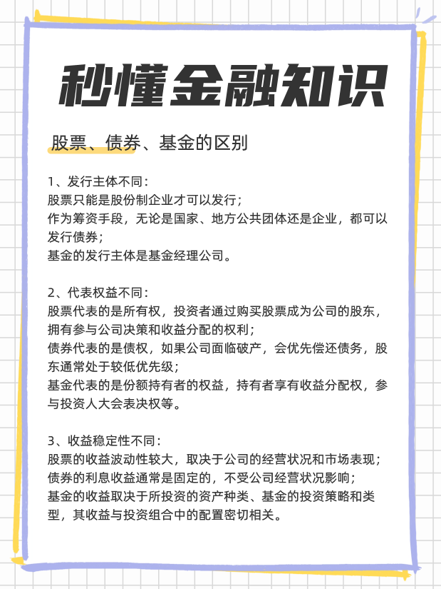《股票、债券、基金有什么区别?投资哪个更好?》由财金股理财知识频道小编撰写,部分内容来自于网络,如有侵权请及时联系我们进行删除。如需转载请注明文章来源,理财有风险,投资需警慎。