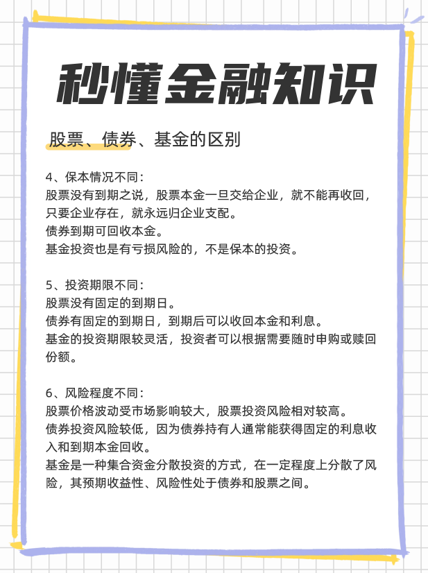 4、保本情况不同:从本金方面看,股票没有到期之说,股票本金一旦交给企业,就不能再收回,只要企业存在,就永远归企业支配。企业如果破产,需要看企业剩余资产清盘状况,这时有较大损失本金的可能。债券到期可回收本金。基金投资也是有亏损风险的,不是保本的投资。