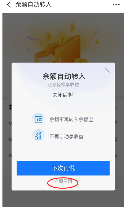 3、选择右上角“...”-“关闭服务”-“立即停用”,当页面显示“同意协议并开通”,才表示关闭成功,关闭后余额资金就不会自动转入余额宝。