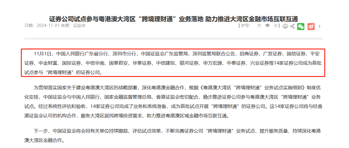 11月1日,中国人民银行广东省分行、深圳市分行,中国证监会广东监管局、深圳监管局联合公告,招商证券、广发证券、国信证券、平安证券、中金财富、国投证券、中信华南、国泰君安、华泰证券、中信建投、银河证券、申万宏源、中泰证券、兴业证券等14家证券公司成为首批试点参与“跨境理财通”的证券公司。