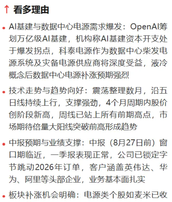 只要股评数据足够,智能体会生成3-5条看多的理由,它们通常是股民提及次数最多的,或者最具有投资参考价值的观点。